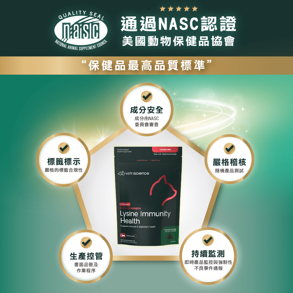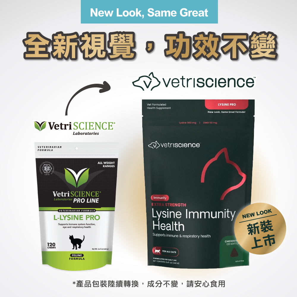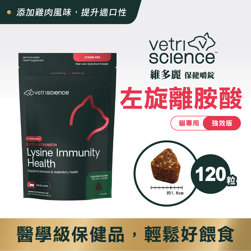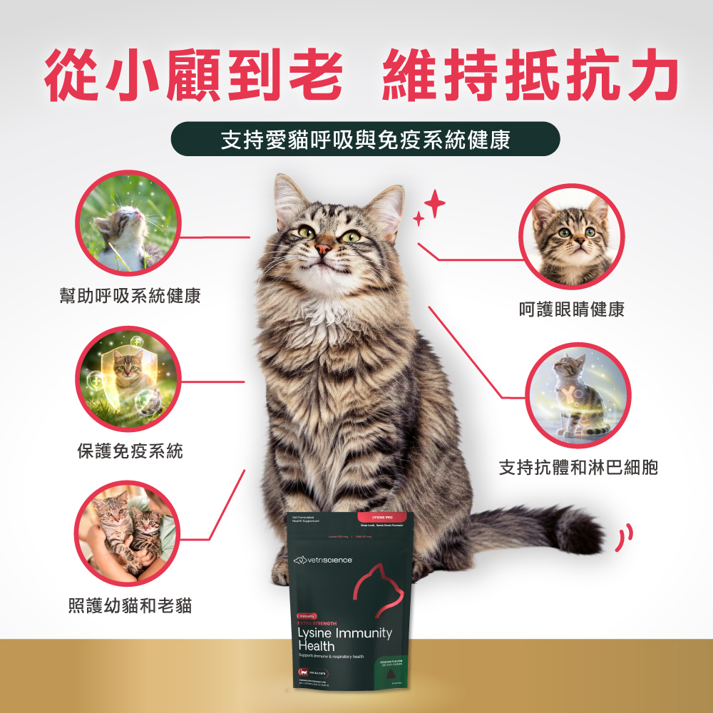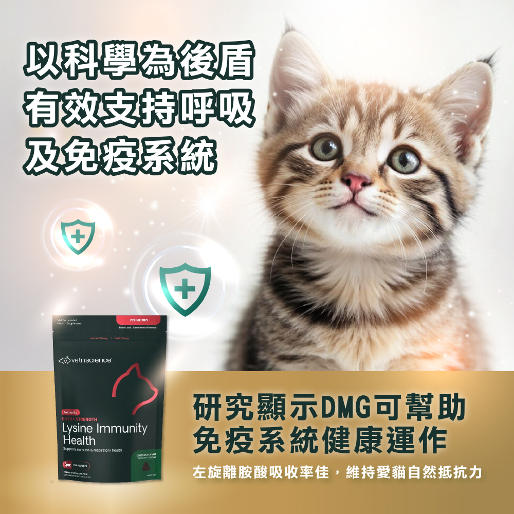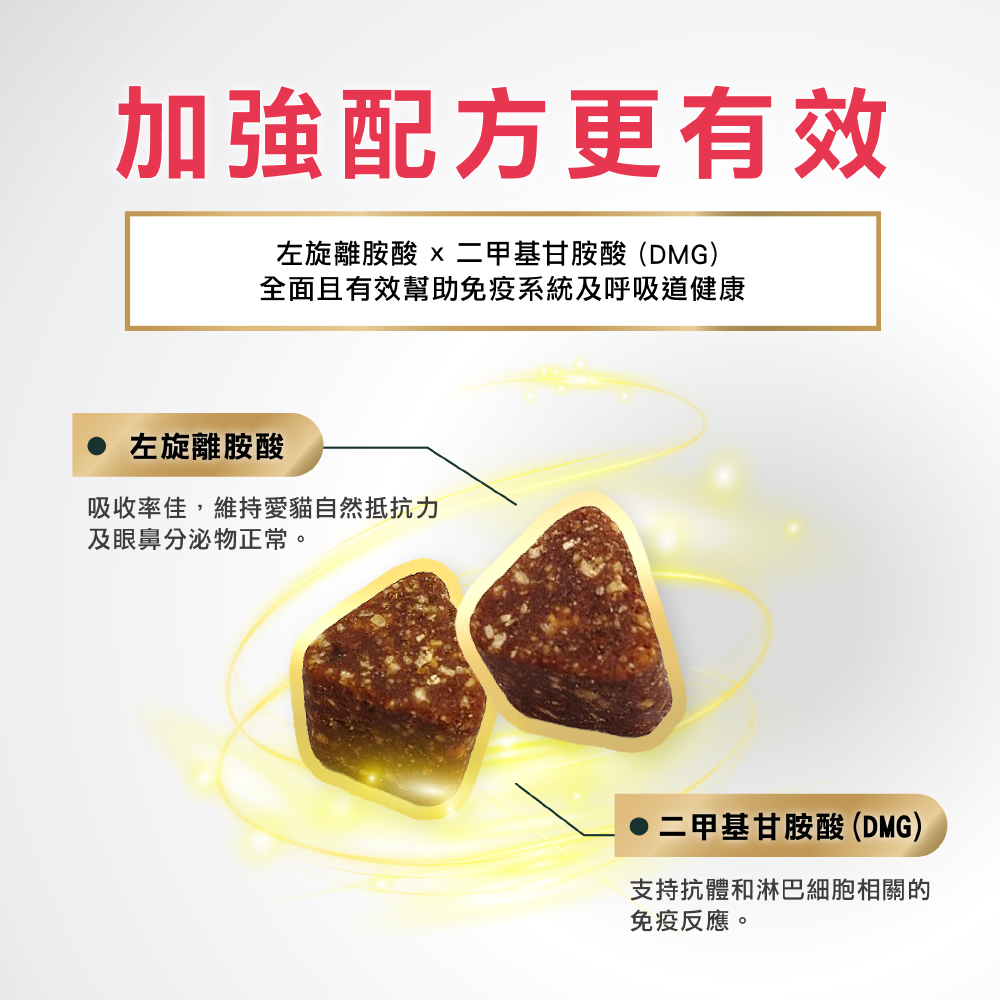 獨家結合離胺酸及二甲基甘胺酸(DMG),支持貓咪免疫系統、眼睛及呼吸系統健康,維持眼鼻分泌物正常。
